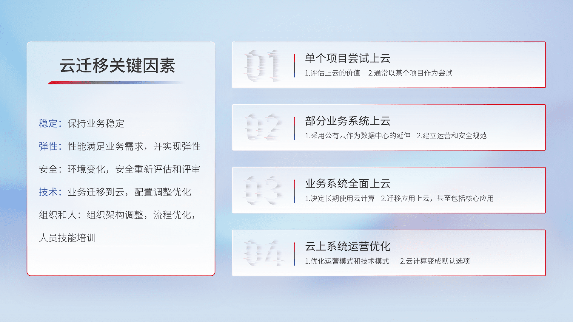 结合实际业务,,,从规划设计、、、云平台选型、、、云原生改造、、数据迁移、、集成交付,,,,迁移全过程为客户识别最佳上云路径,,,做好风险识别管理,,设计网络架构、、、身份权限、、、、安全审计合规、、、、操作审计、、、日志审计、、、、监控告警策略、、、多站点容灾设计等,,对云上基础设施进行整体规划,,,,提升IT治理水平,,,以满足弹性、、、高可用、、高性能的需求。。。。