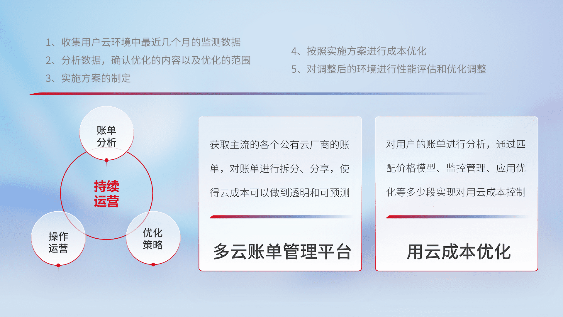 通过多云纳管,,,,以统一的资源数据模型把客户的云资源进行抽象和封装,,,进而实现对多云资源的统一操作,,,,保障云资源管理的可靠性、、稳定性与可用性。。。量身定制化运维内容,,,,配置、、、、开发运维、、、补丁管理、、备份、、监控、、、、认证和访问管理、、、、审计和日常巡检等,,,,保障在用云过程中的可靠度,,,,稳定度以及高可用率。。。